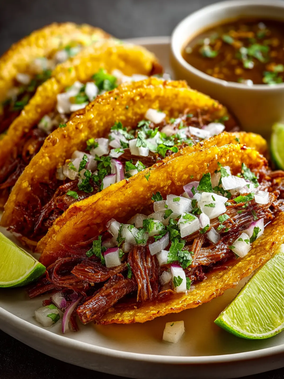 Serve: Arrange the crispy birria tacos on a platter and serve immediately with small bowls of warm birria consommé for dipping, along with fresh cilantro, finely diced white onion, and lime wedges.
