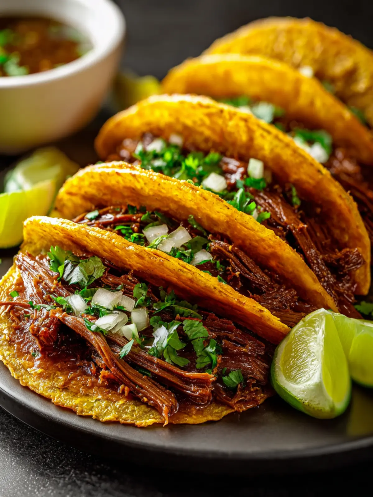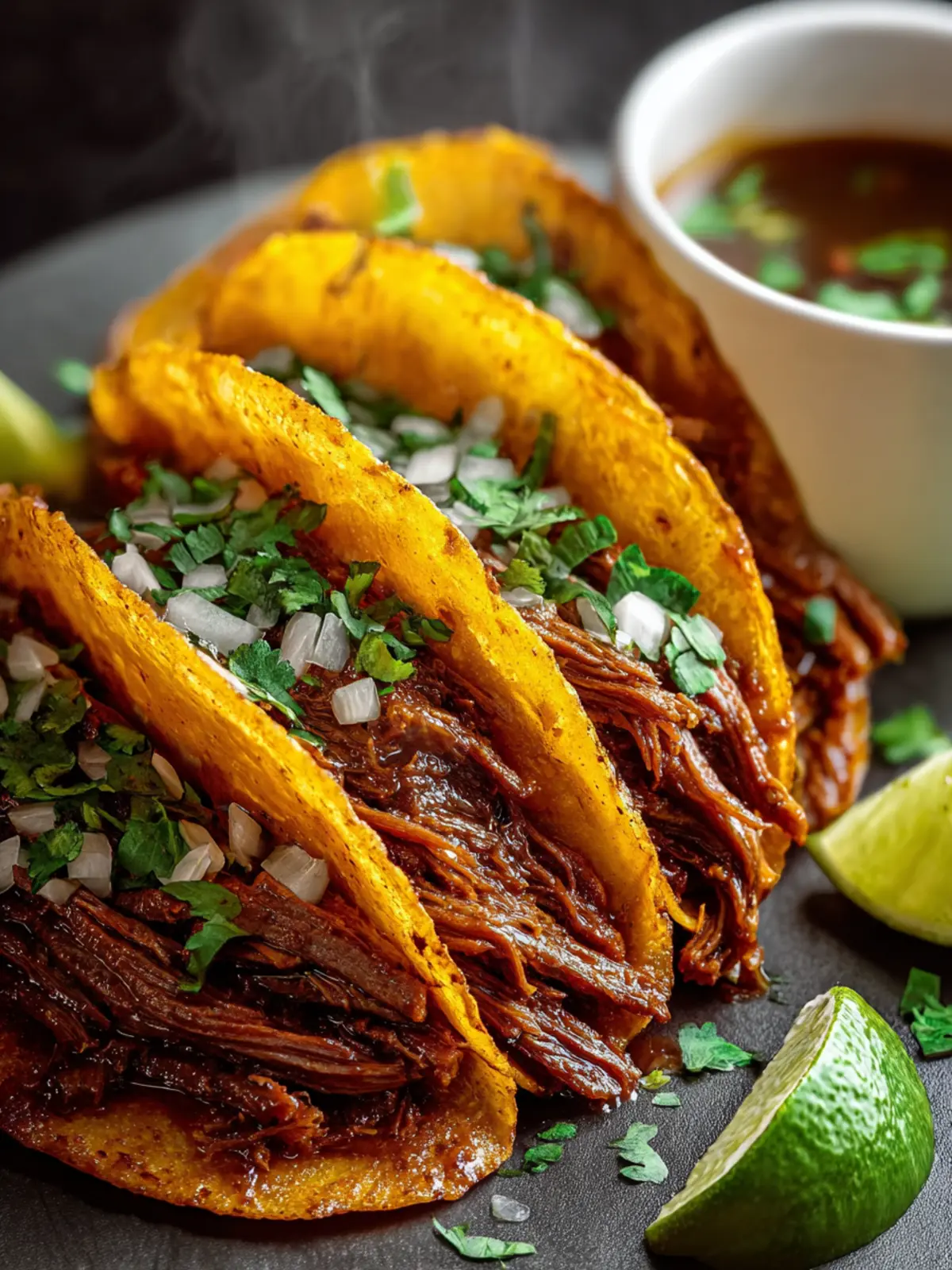 Warm your corn tortillas before assembly. Use two tortillas per taco for added sturdiness, and don’t forget to include fresh toppings like diced onions, cilantro, and a squeeze of lime. The combination of flavors and textures brings your beef birria tacos to life.