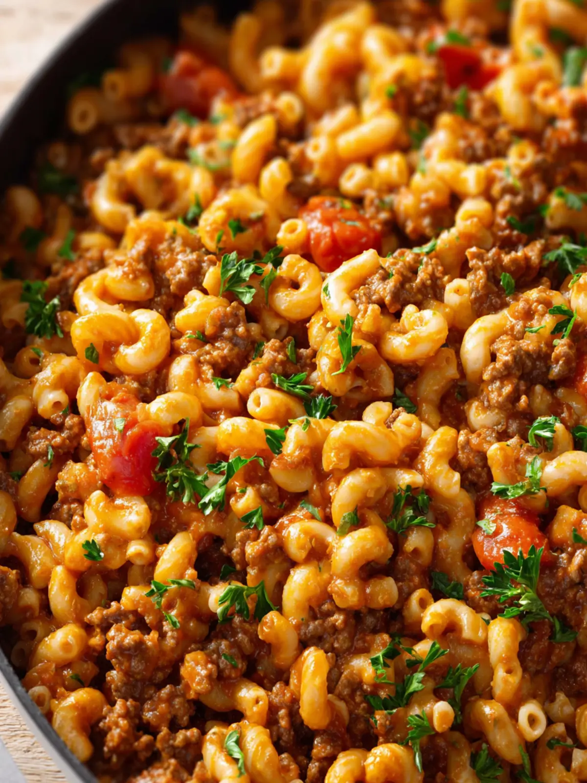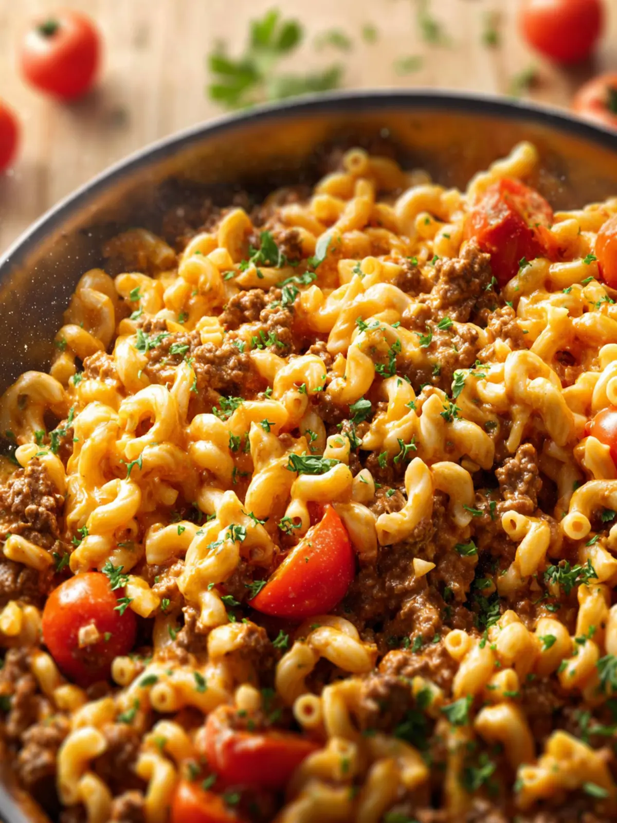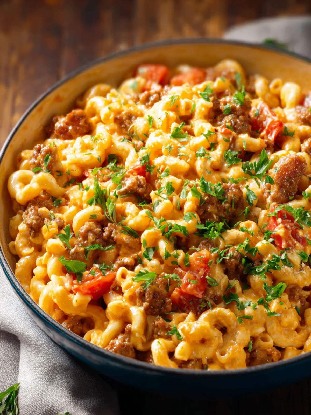 A delicious creamy macaroni dish with ground beef, ideal for a family meal.