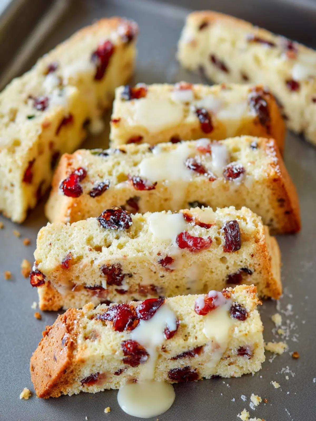 Delicious homemade biscotti with white chocolate chips and dried cranberries.