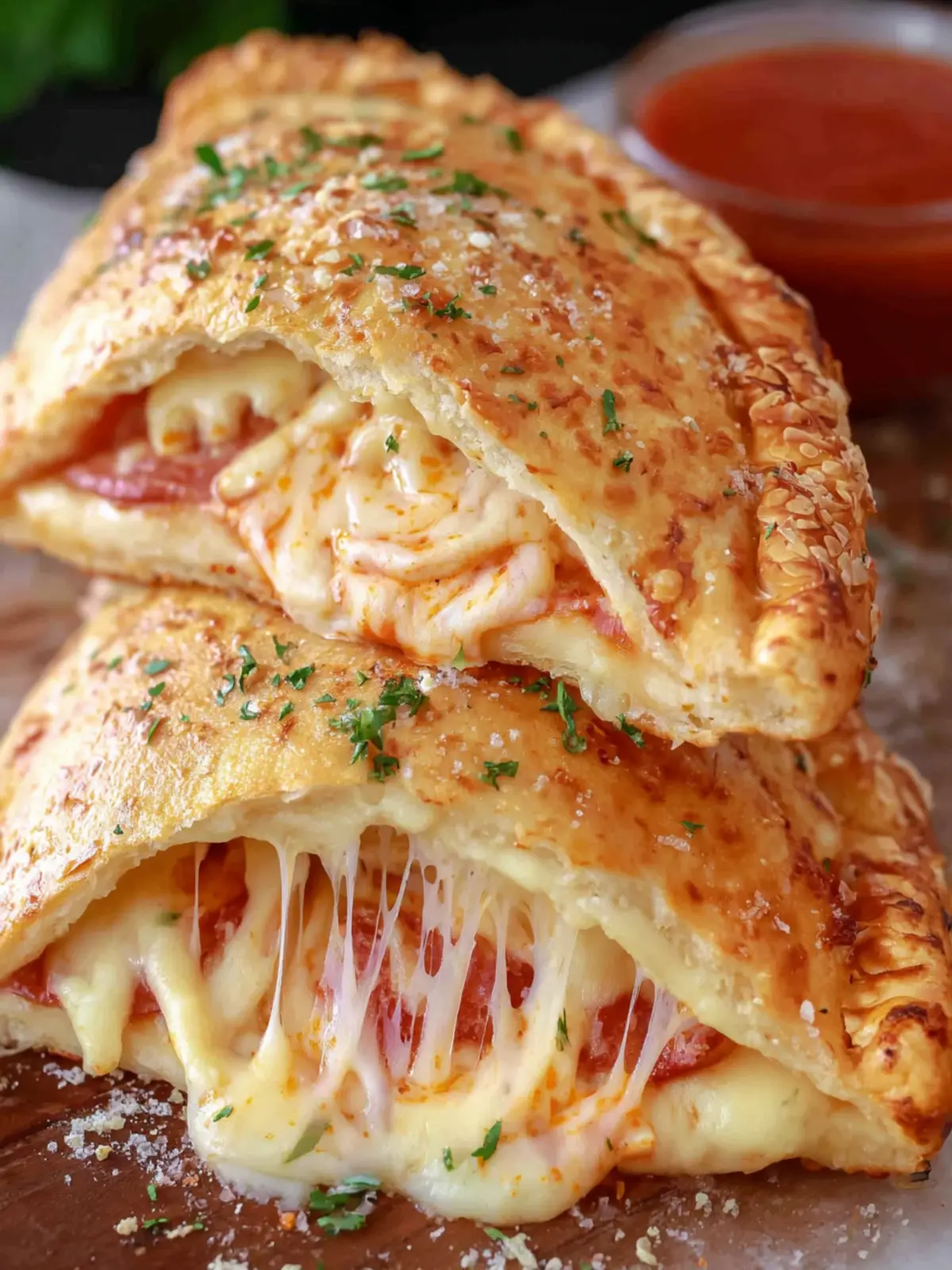 Delicious homemade calzones filled with cheese, pepperoni, and marinara sauce.
