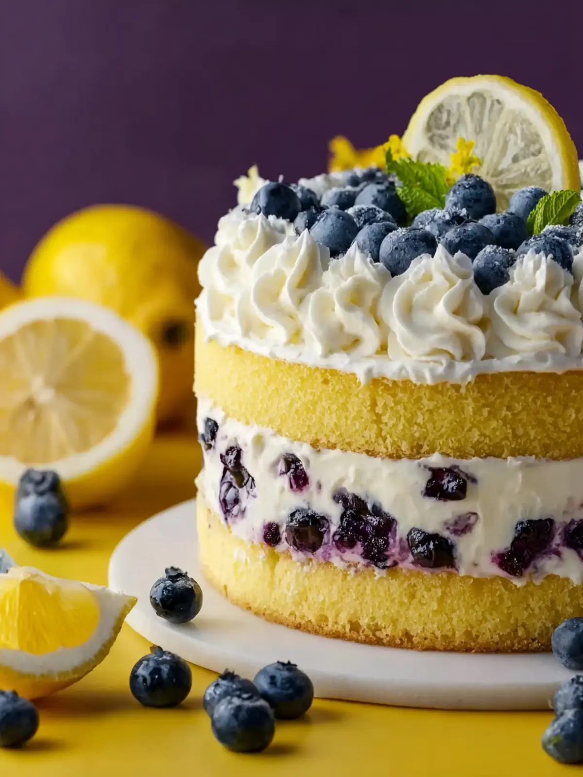 - Once the cakes are fully cooled, place one layer on your serving plate. Spread a generous layer of the whipped lemon frosting over the top, then add the second cake layer. Frost the top and sides with the remaining frosting. Garnish with extra blueberries or lemon zest if desired.
