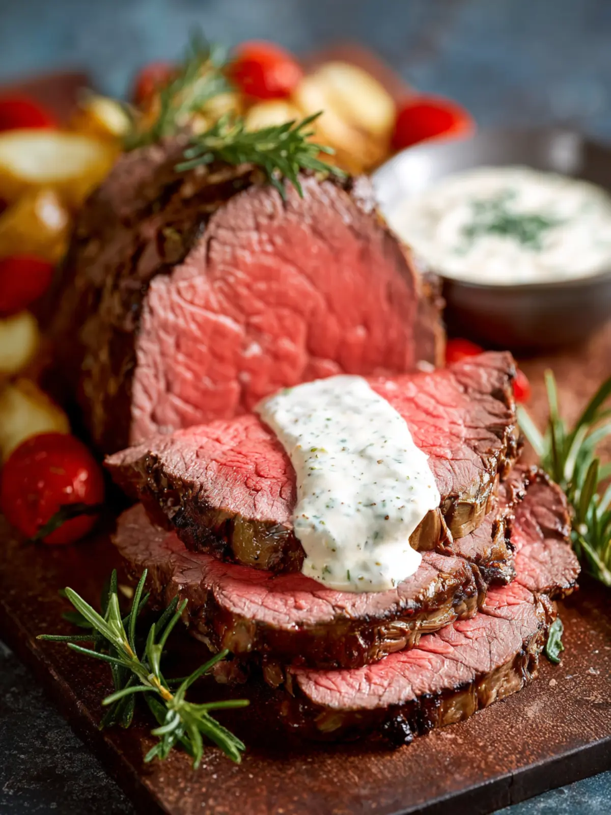- Slice the beef against the grain, drizzle with horseradish sauce, and garnish with chives or parsley.