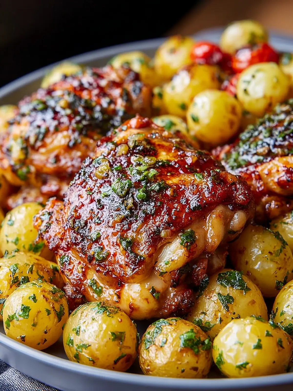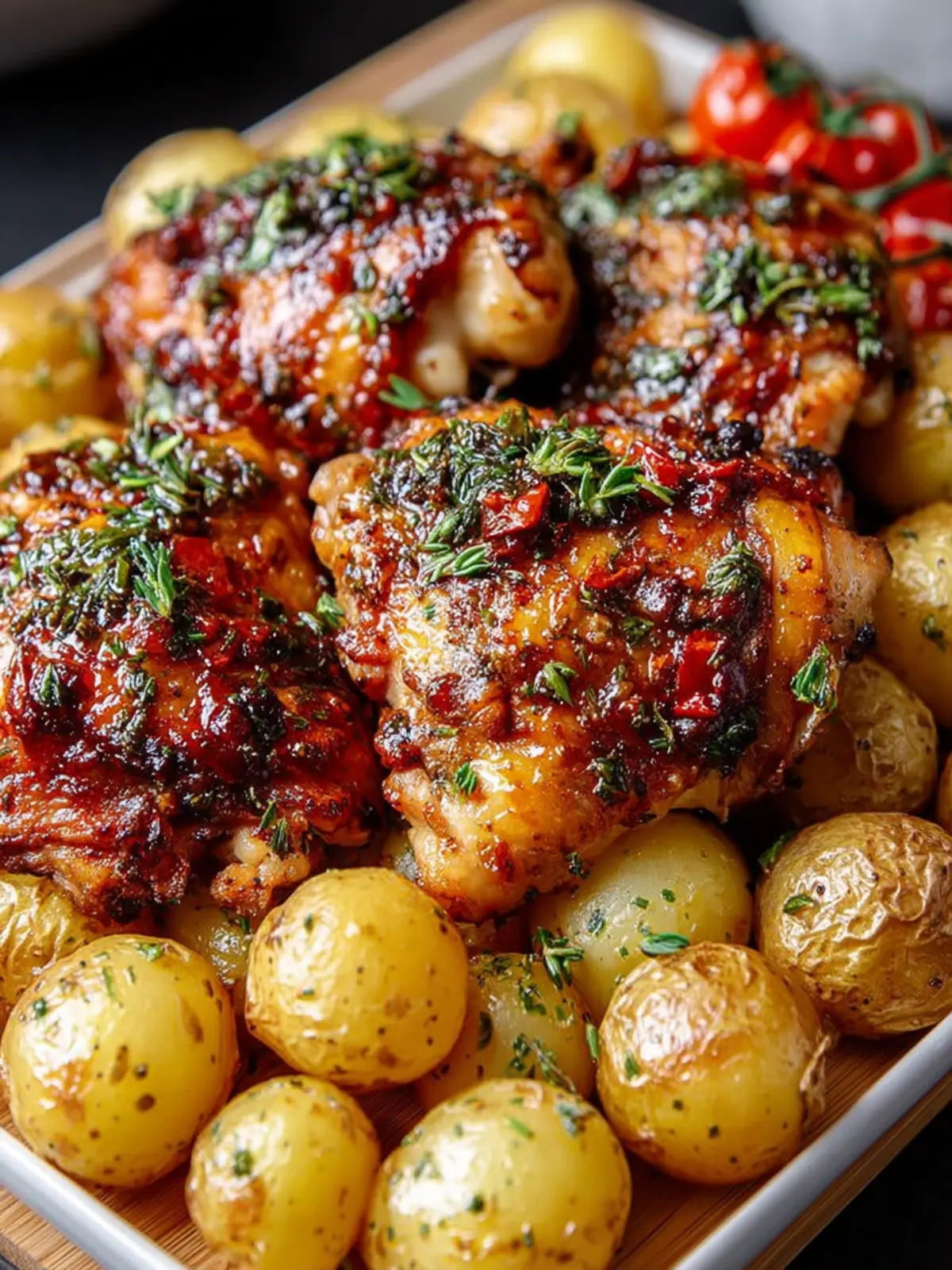 Deliciously roasted bone-in chicken thighs paired with crispy baby potatoes, seasoned perfectly for a delightful meal.
