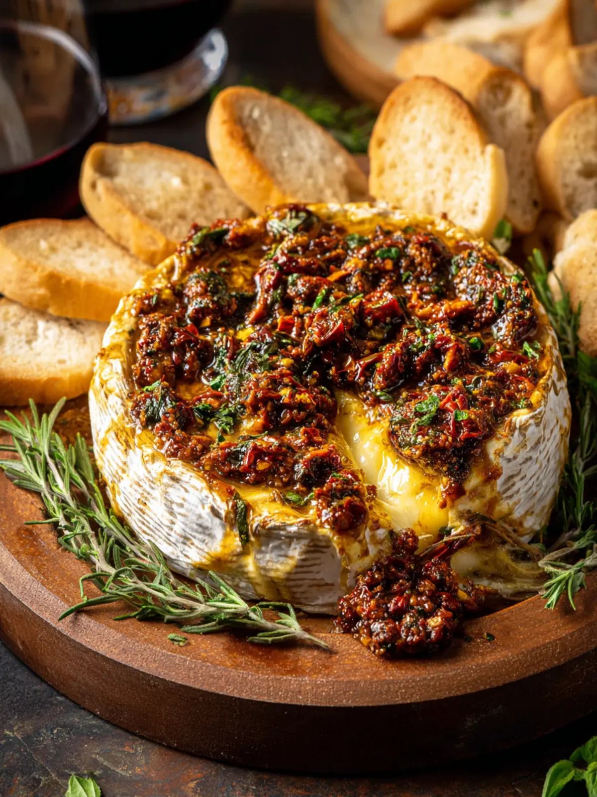 Savory Baked Brie: Indulgent Delight with Sun-Dried Tomato Pesto