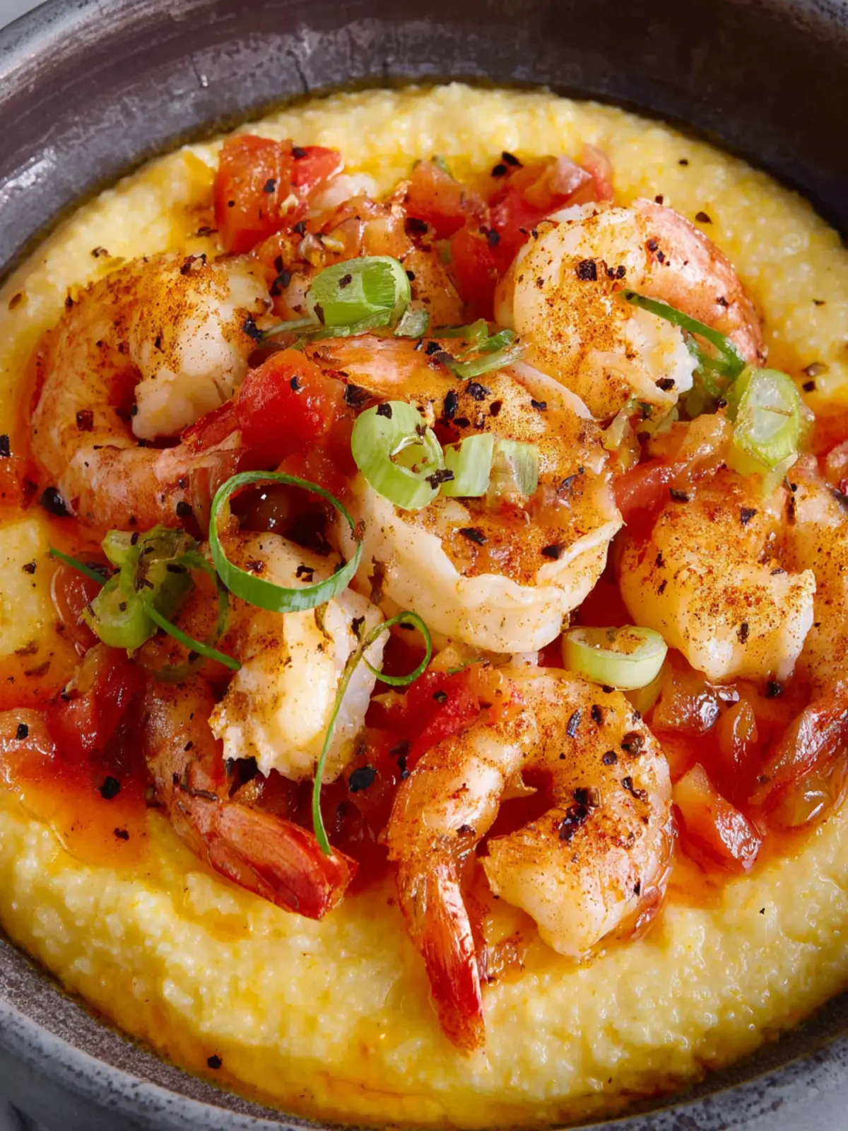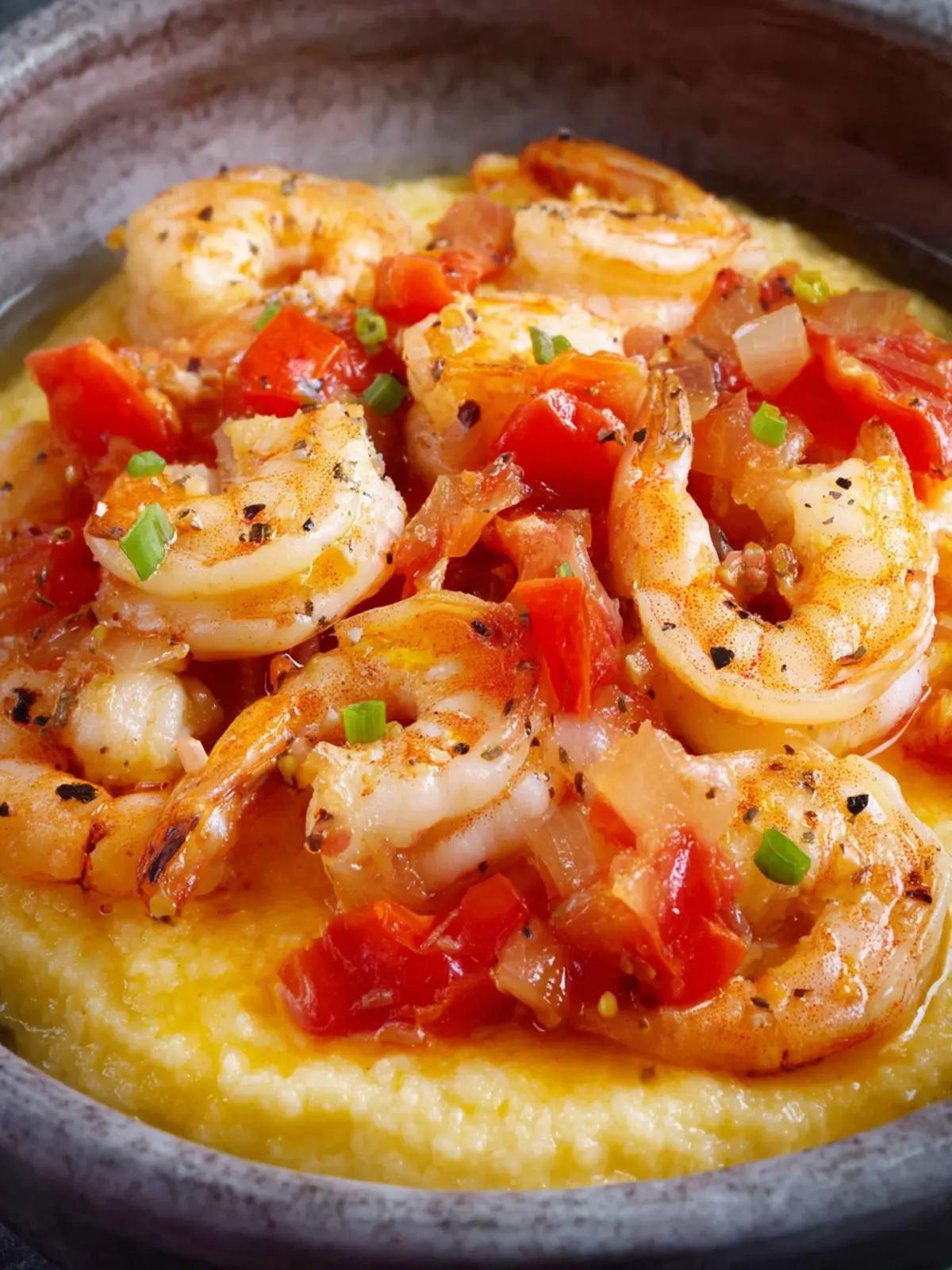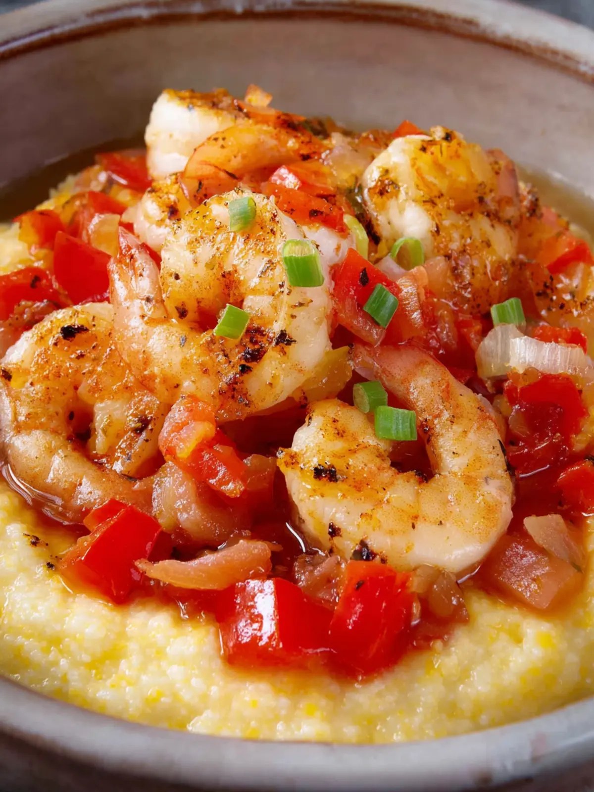 A delicious and creamy cheese grits dish topped with succulent shrimp and vegetables.