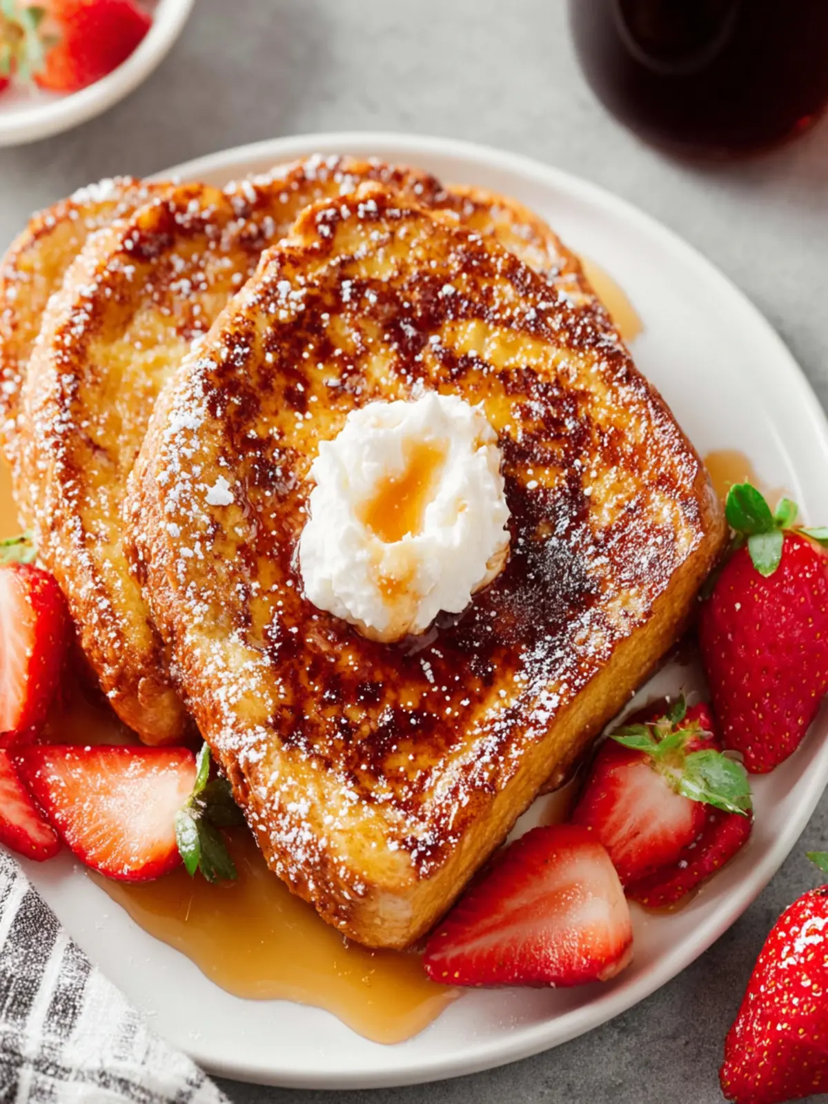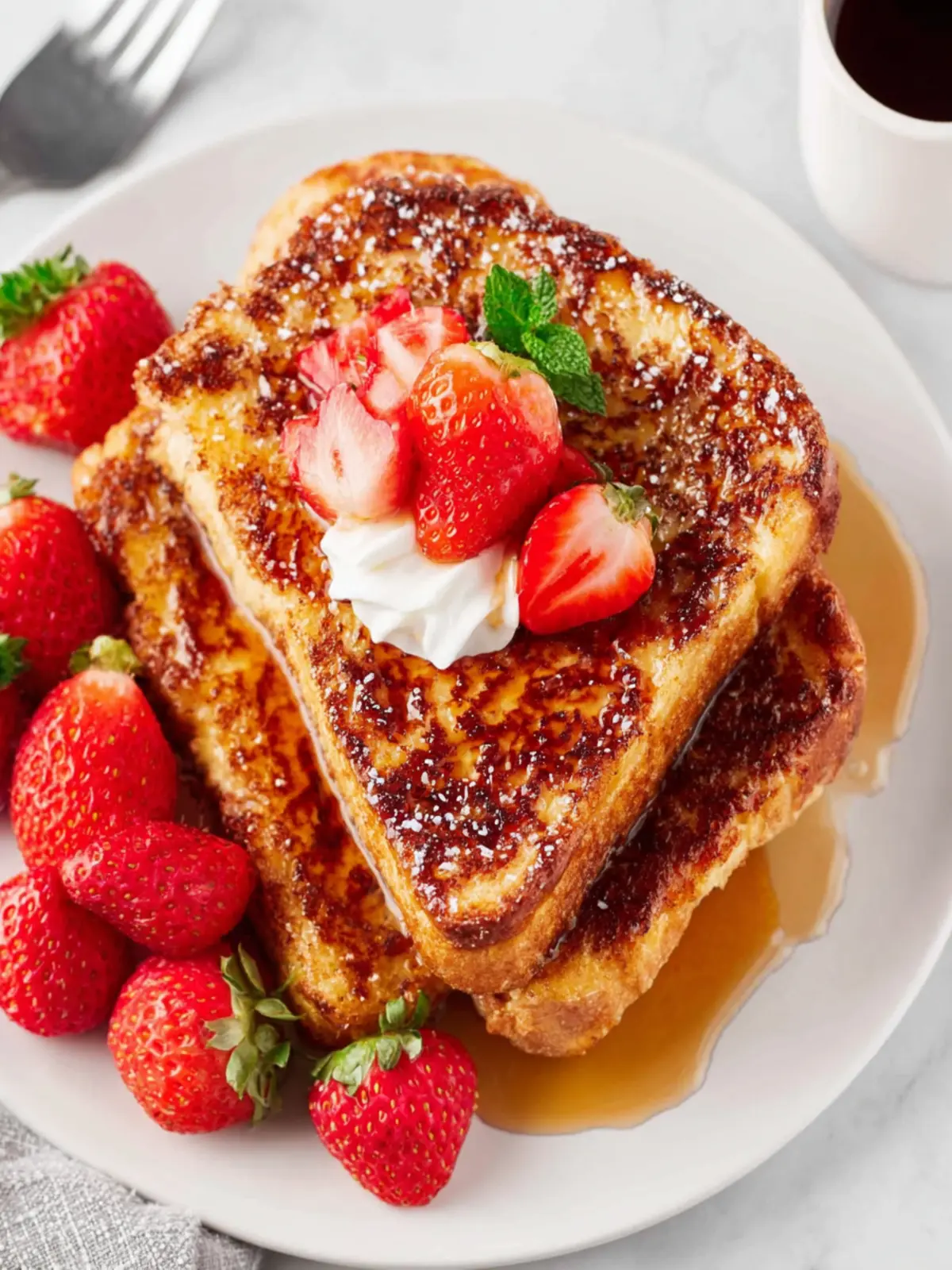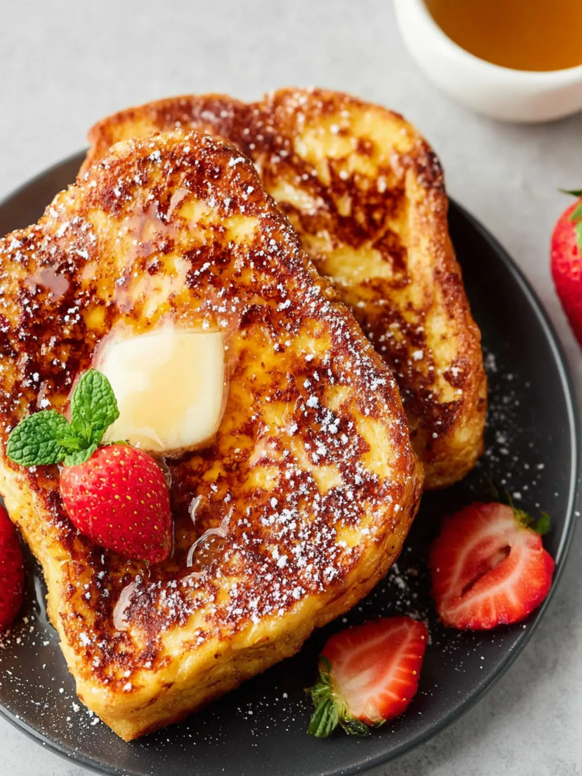 - Plate the French toast and serve immediately with your favorite toppings, such as maple syrup, a dusting of powdered sugar, or fresh berries.