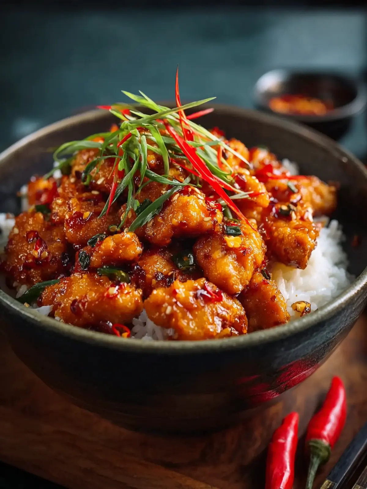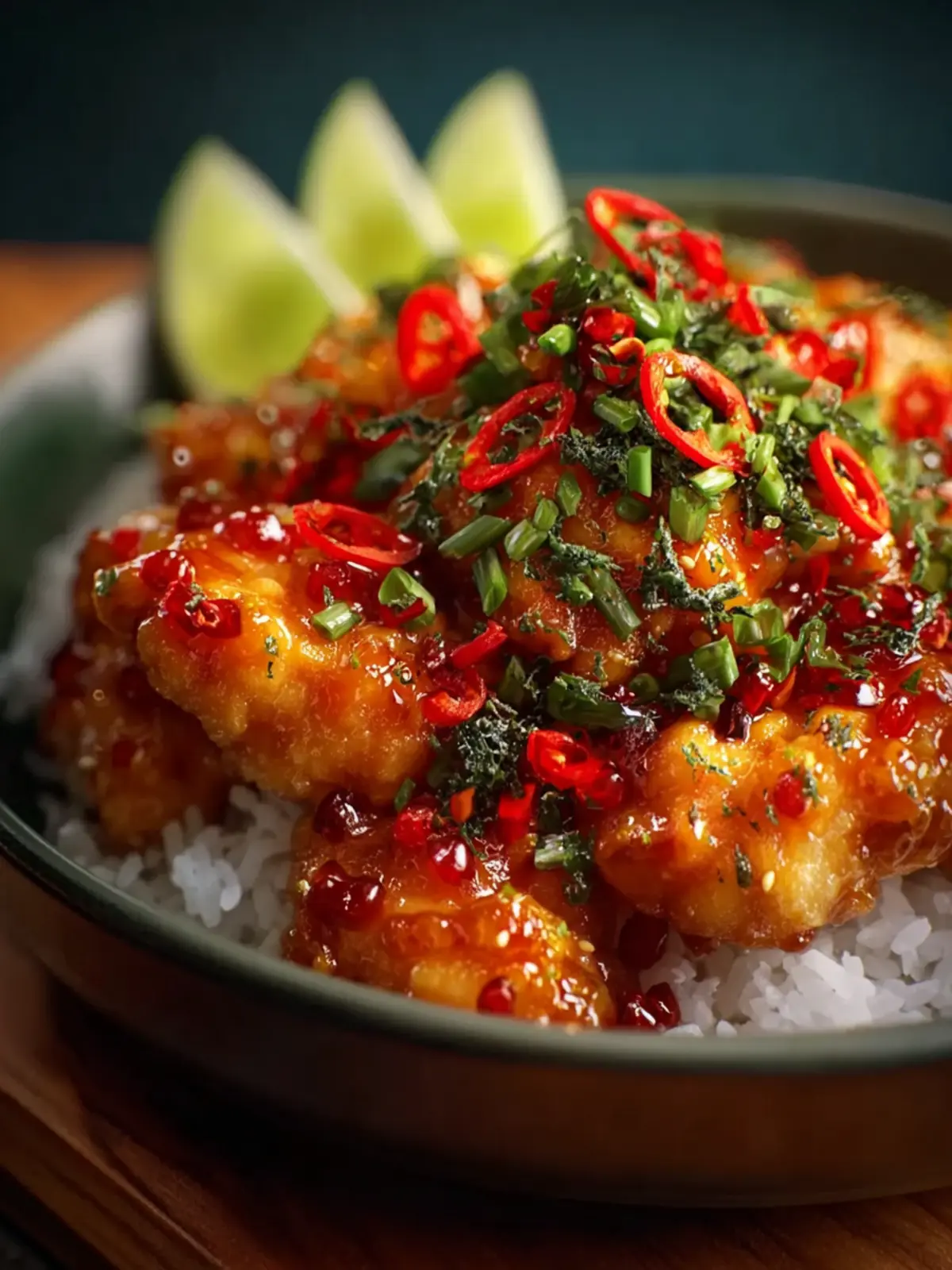 This crispy Thai chicken recipe features tender chicken pieces coated in a light cornstarch batter, fried to perfection, and tossed in a flavorful sweet chili sauce.